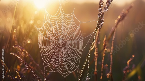 Wall mural a high-resolution photo of a spider web on grass, illuminated by the sun through the web's intricate - Wall murals Wall mural a high-resolution photo of a spider web on grass, illuminated by the sun through the web's intricate - Wall murals
