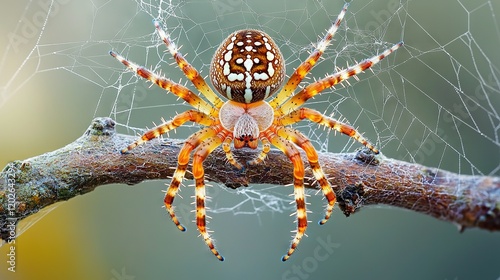 The watermark will not be included on Wall mural.: A macro shot of a spider perched on a twig with a web sprawled across its torso