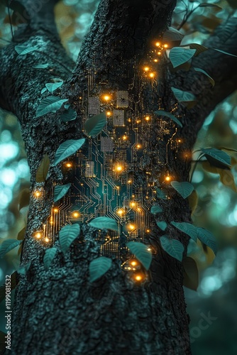 The watermark will not be included on Wall mural.: Abstract tree design with branches forming a glowing node network resembling a digital circuit board