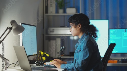 Wall mural an asian coder works late into the night, designing software applications and enhancing system secur