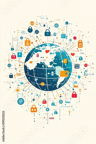 Wall mural illustration of globe with padlock and key icons connected by digital lines, symbolizing global data - Wall murals Wall mural illustration of globe with padlock and key icons connected by digital lines, symbolizing global data - Wall murals