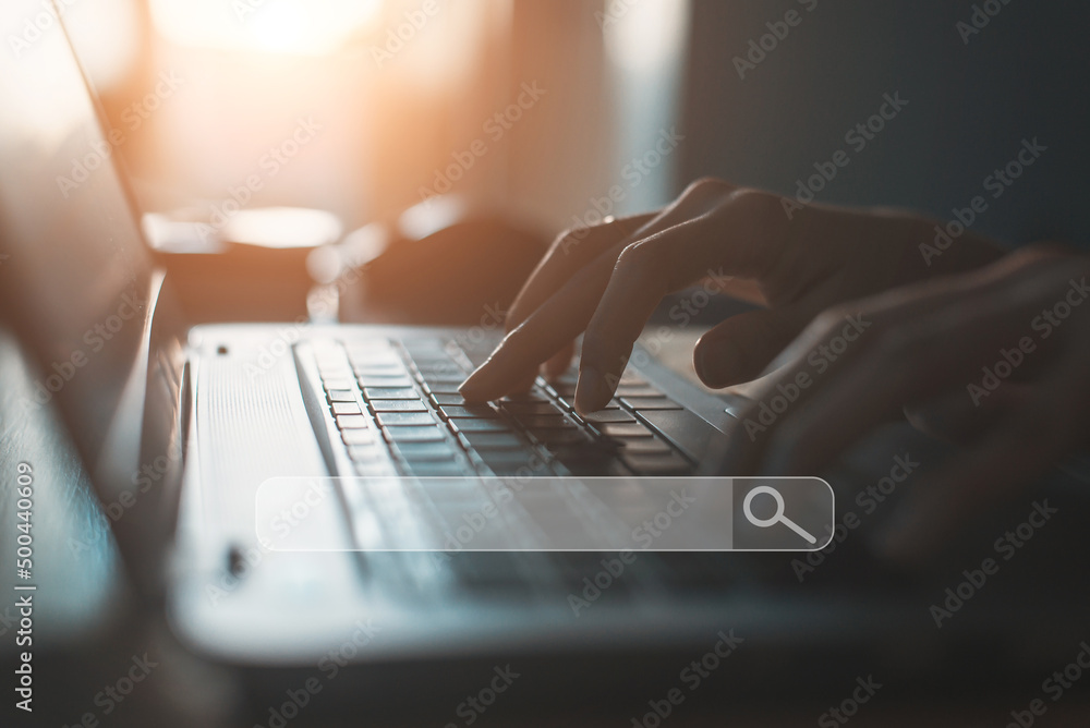 The watermark will not be included on Wall mural.: People hand using laptop or computor searching for information in internet online society web with s