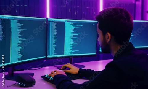 Wall mural smart it developer working on laptop to type searching in software coding system at neon light offic - Wall murals Wall mural smart it developer working on laptop to type searching in software coding system at neon light offic - Wall murals