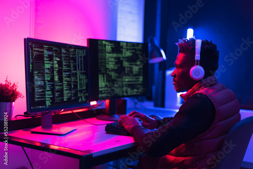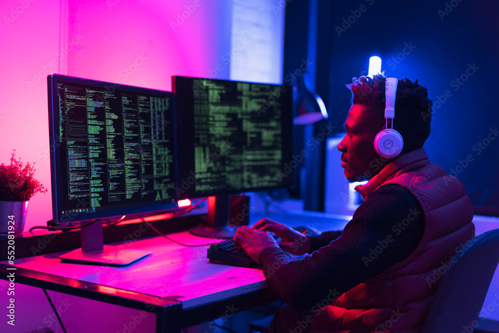 Wall mural software developer coding on his computer. coding and hacking concept
