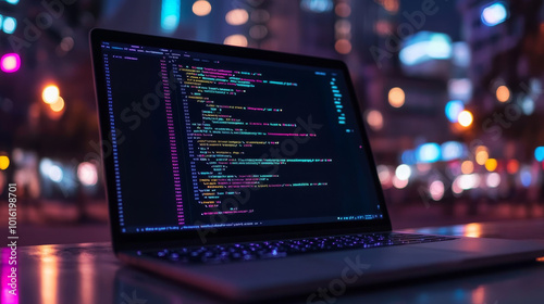 Wall mural this illustration showcases a laptop computer with lines of code displayed on the screen, representi - Wall murals Wall mural this illustration showcases a laptop computer with lines of code displayed on the screen, representi - Wall murals