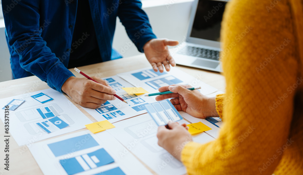 Wall mural : Ux developer and ui designer brainstorming about mobile app interface wireframe design with customer