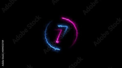 The watermark will not be included on Wall mural.: 10 second countdown timer animation with neon number text glowing from 10 to 1 with interesting circ