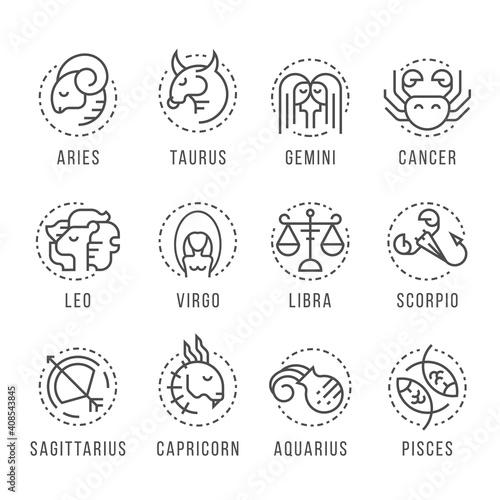 The watermark will not be included on Wall mural.: 12 horoscope mono line border and dash circle icon collection vector design