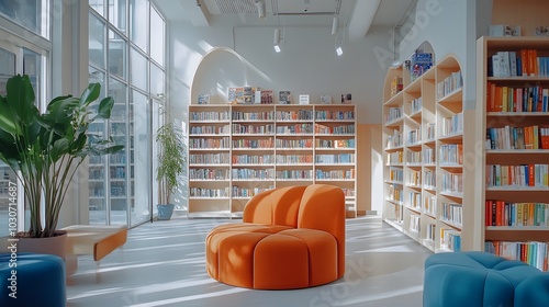 Wall mural 120. a wide empty space in a bright bookstore with plush seating