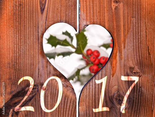 Wall mural : 2017, wooden frame in the shape of a heart and branch of holly under the snow in the background