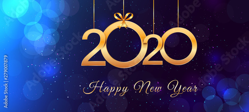 2020 happy new year vintage text design with shiny golden numbers and ribbon bows on blue backgroundWall mural