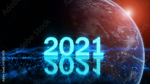 Wall mural 2021 vision technology. global network for the exchange of data on the planet earth. blue black grou