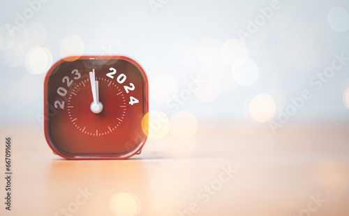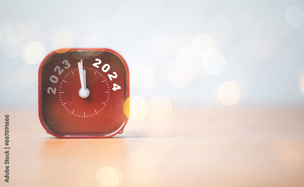 2023 and 2024 on red alarm clock on wooden table with copy space and bokeh , merry christmas and hapWall mural