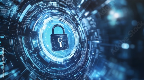Wall mural : 3 - "a modern digital padlock against a dynamic blue and white background, featuring flowing binary c