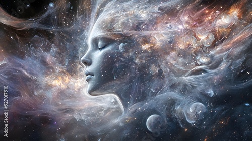 The watermark will not be included on Wall mural.: 36 - "an ethereal being surrounded by swirling constellations and cosmic dust in a vast universe