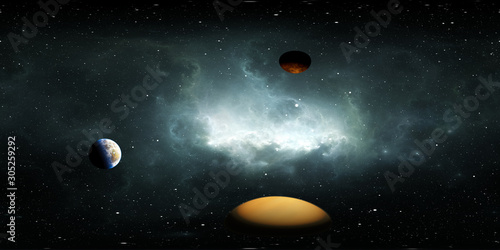 Wall mural 360 degree space background with exoplanets or extrasolar planets, nebula and stars, equirectangular