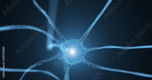 Wall mural : 3d animated neuron cell with flashing light copy space background -
