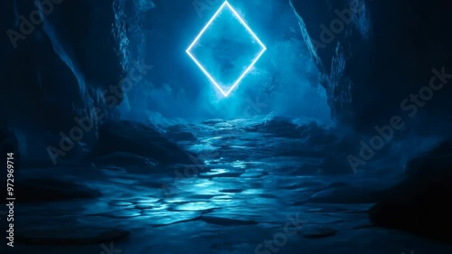 Wall mural 3d animation of a glowing blue rhombus in a cave with mystical light