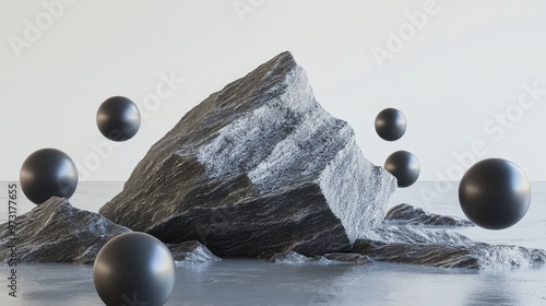 The watermark will not be included on Wall mural.: 3d animation of a gray rock with floating black spheres against a background of minimalistic space