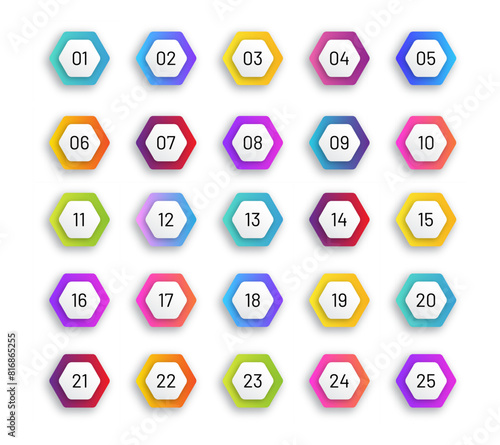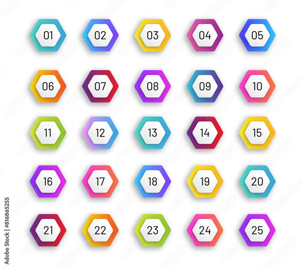 Wall mural : 3d arrow number bullet points from 1 to 25 - hexagon shapes with shadow
