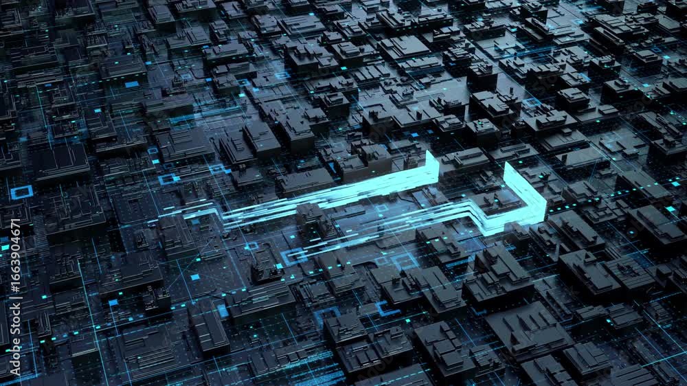 The watermark will not be included on Wall mural.: 3d black cube circuit landscape with glowing blue digital lines - abstract technology background with