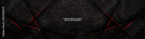 Wall mural : 3d black rough grunge techno abstract background overlap layer on dark space with red lines decorati