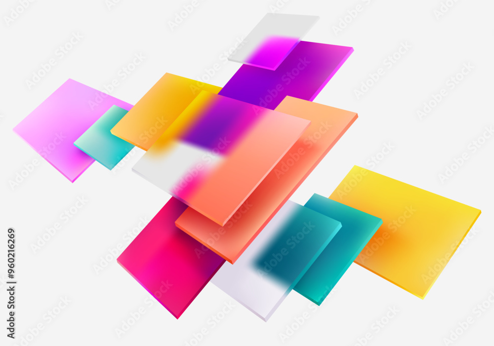 Wall mural 3d colorful squares and rectangles in glass morphism style. transparent frame for text with geometri
