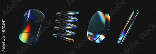 Wall mural 3d crystal glass shapes with refraction and holographic effect isolated on dark background. render t