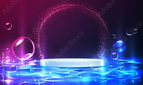 Wall mural 3d display product stand on blue water ripples background with floating bubbles. 3d realistic round