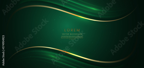 Wall mural 3d gold curved lines on dark green background with lighting effect and sparkle with copy space for t