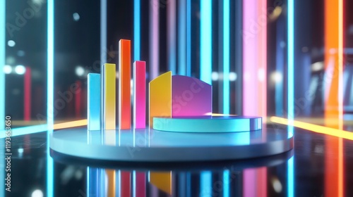 Wall mural 3d graphs on a sleek reflective surface in a modern setting. this futuristic and vibrant visual conc