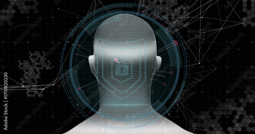 3d head silhouette rotating in virtual interface, with hud rings, hexagon grid and network nodesWall mural