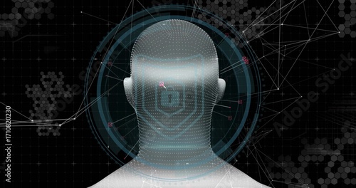 The watermark will not be included on Wall mural.: 3d head silhouette rotating in virtual interface, with hud rings, hexagon grid and network nodes