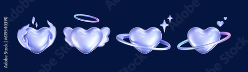 The watermark will not be included on Wall mural.: 3d holographic hearts in y2k style isolated on dark background - render of 3d iridescent chrome heart