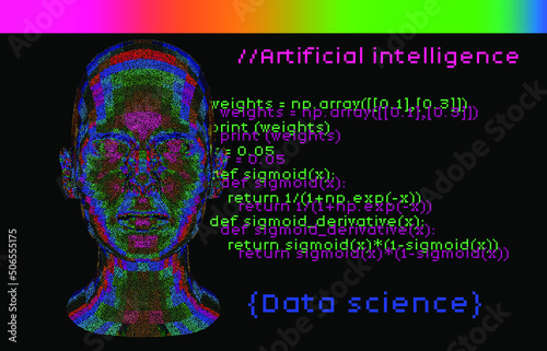 The watermark will not be included on Wall mural.: 3d human head made of colorful particles on the dark background with random pseudocode of a neural n