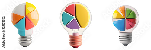 Wall mural 3d icon of a colorful light bulb with a pie chart, white isolated background for clipping