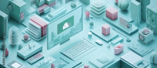 The watermark will not be included on Wall mural.: 3d illustration of a computer screen with a cloud icon and a keyboard on a turquoise background -