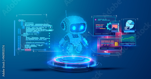 3d illustration of a futuristic robot surrounded by digital interfaces and data visualizations, reprWall mural