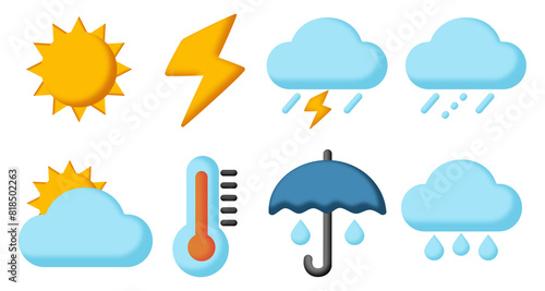 The watermark will not be included on Wall mural.: 3d illustration of a set of weather forecast icons with sun and lightning with rain clouds and an um