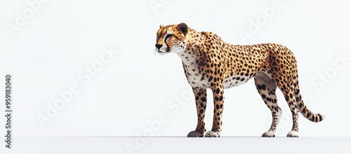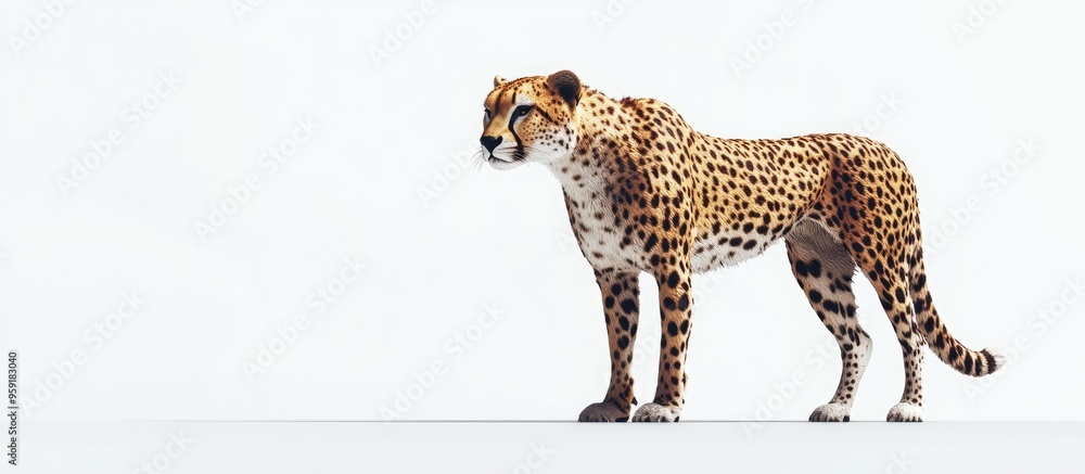 The watermark will not be included on Wall mural.: 3d illustration of a side view of a cyber cheetah standing on a white background with ample copy spa