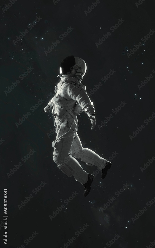 Wall mural 3d illustration of astronaut flying in space. 5k realistic science fiction art. elements of image pr - Wall murals Wall mural 3d illustration of astronaut flying in space. 5k realistic science fiction art. elements of image pr - Wall murals