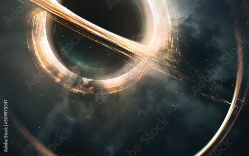 The watermark will not be included on Wall mural.: 3d illustration of huge black hole warps space around - 5k realistic science fiction art - elements of