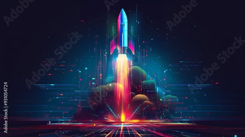 Wall mural 3d illustration rocket space colorful holographic in dark background for business start up and scien - Wall murals Wall mural 3d illustration rocket space colorful holographic in dark background for business start up and scien - Wall murals