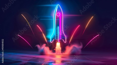 The watermark will not be included on Wall mural.: 3d illustration rocket space colorful holographic in dark background for business start up and scien