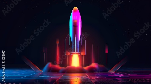 The watermark will not be included on Wall mural.: 3d illustration rocket space colorful holographic in dark background for business start up and scien