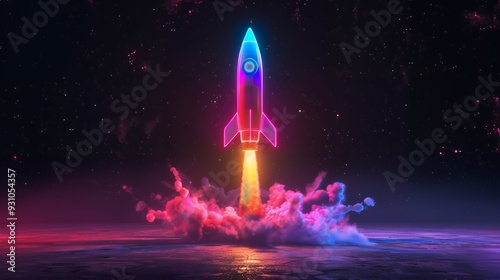 The watermark will not be included on Wall mural.: 3d illustration rocket space colorful holographic in dark background for business start up and scien
