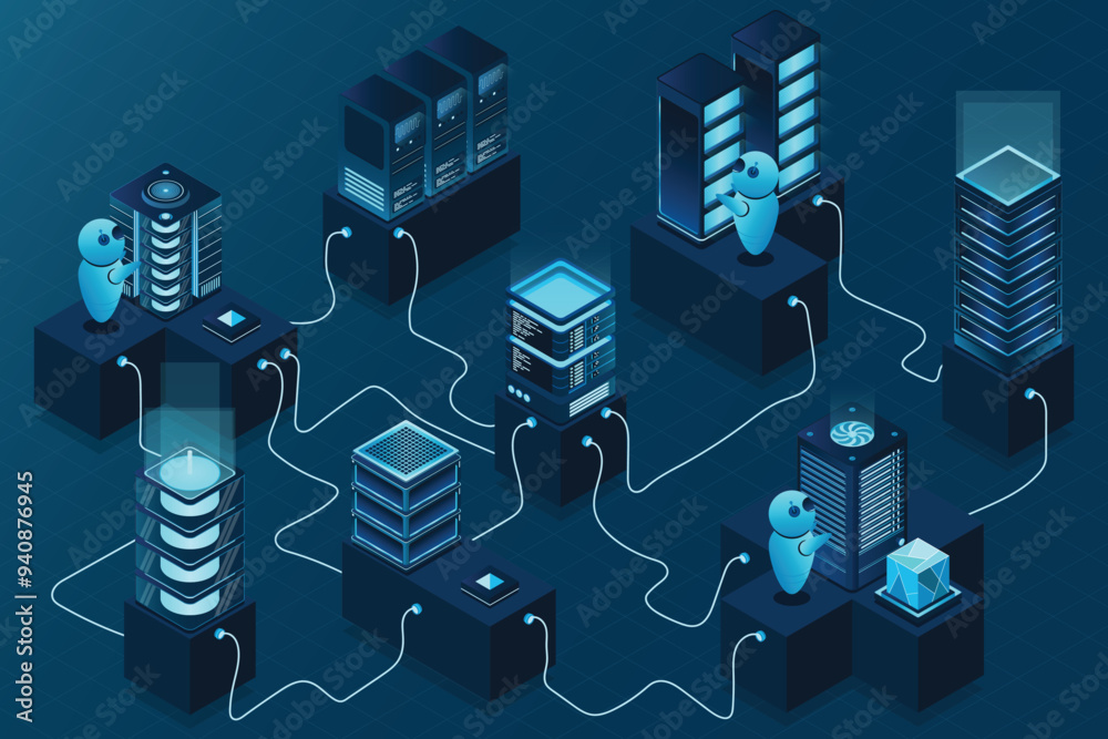 Wall mural 3d isometric concept big data center with server. cloud computing. network mainframe infrastructure. - Wall murals Wall mural 3d isometric concept big data center with server. cloud computing. network mainframe infrastructure. - Wall murals