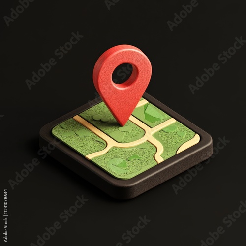 Wall mural 3d isometric map icon with red location pin on dark background. - Wall murals Wall mural 3d isometric map icon with red location pin on dark background. - Wall murals