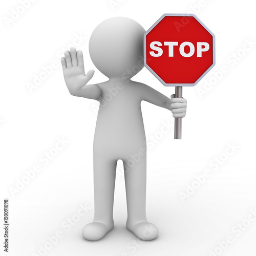 Wall mural 3d man showing stop gesture and holding stop sign over white background with shadow . 3d rendering. - Wall murals Wall mural 3d man showing stop gesture and holding stop sign over white background with shadow . 3d rendering. - Wall murals