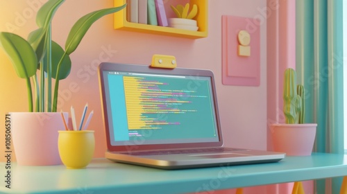 The watermark will not be included on Wall mural.: 3d minimalist laptop mockup showcasing coding and software development in a cartoon-style design for